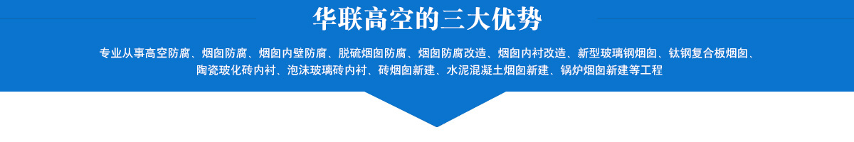主要承接高空防腐、煙囪防腐、煙囪內壁防腐、脫硫煙囪防腐、煙囪防腐改造、煙囪內襯改造、新型玻璃鋼煙囪、鈦鋼復合板煙囪、陶瓷?;u內襯、泡沫玻璃磚內襯、磚煙囪新建、水泥混凝土煙囪新建、鍋爐煙囪新建、鈦鋼煙囪新建制作安裝等各項業務